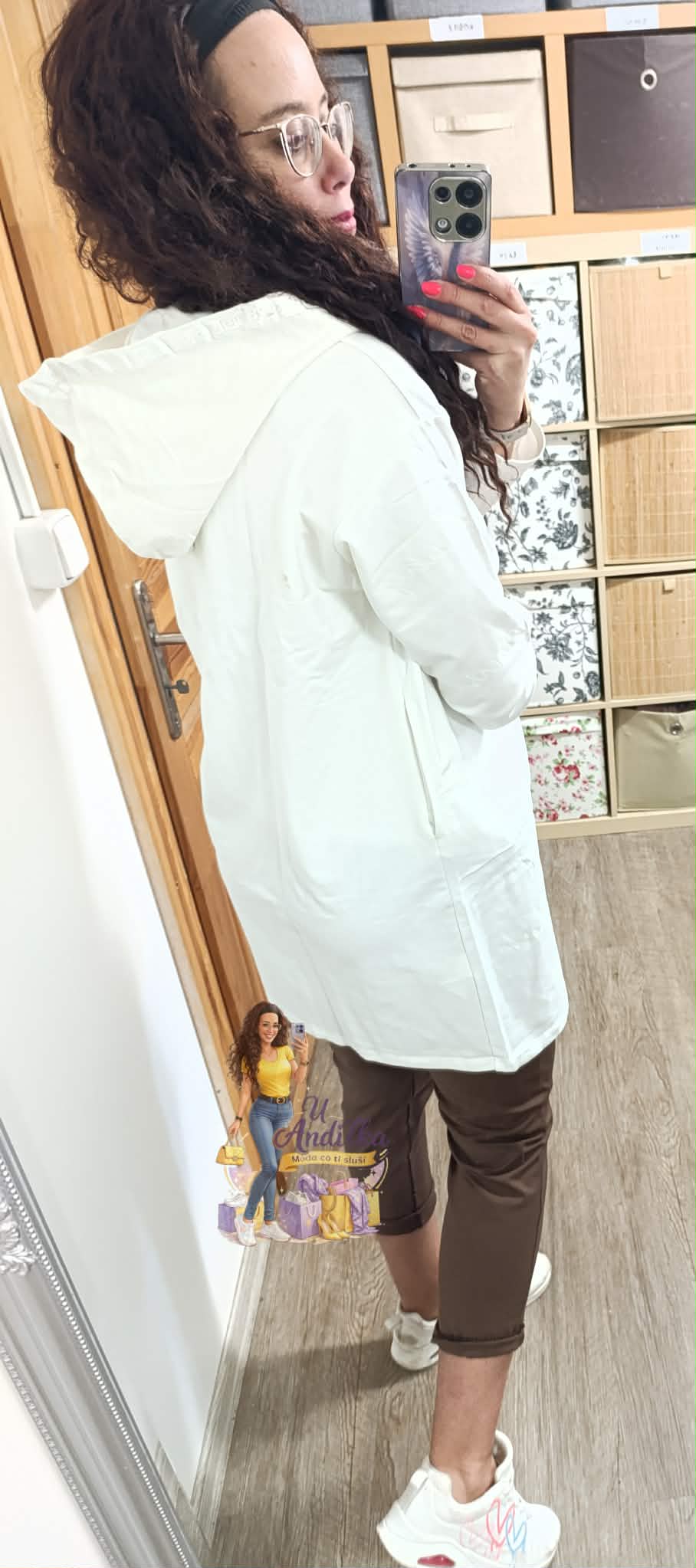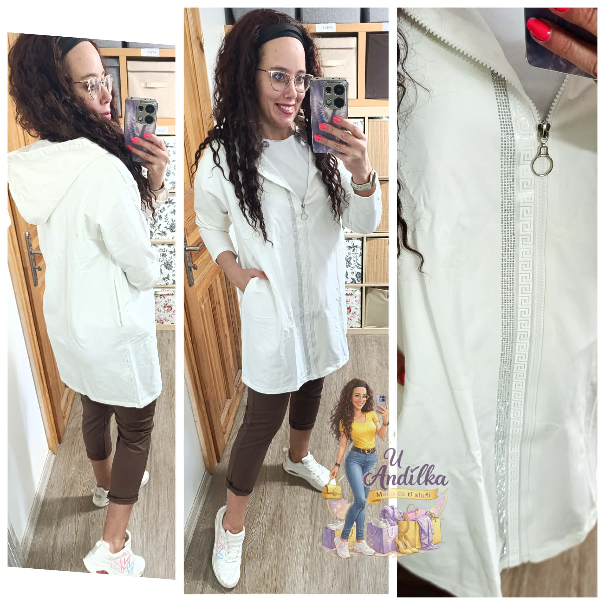 Oversize luxusni cardigan, tenka mikina, kabátek kaminky a zdobení kolem kapuce a zipu, nápisy Be Happy