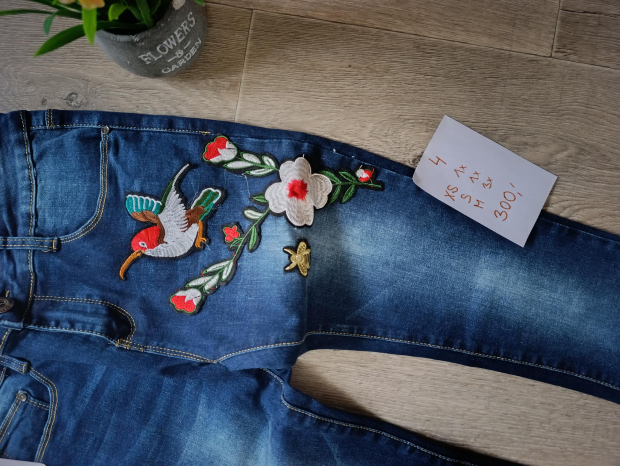 Krásné džíny s nádhernou nášivkou ptáčka