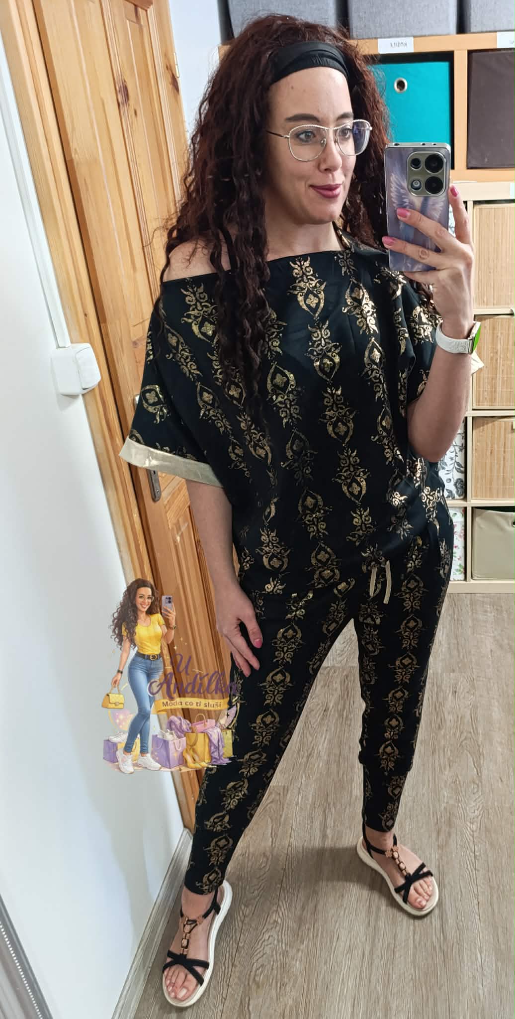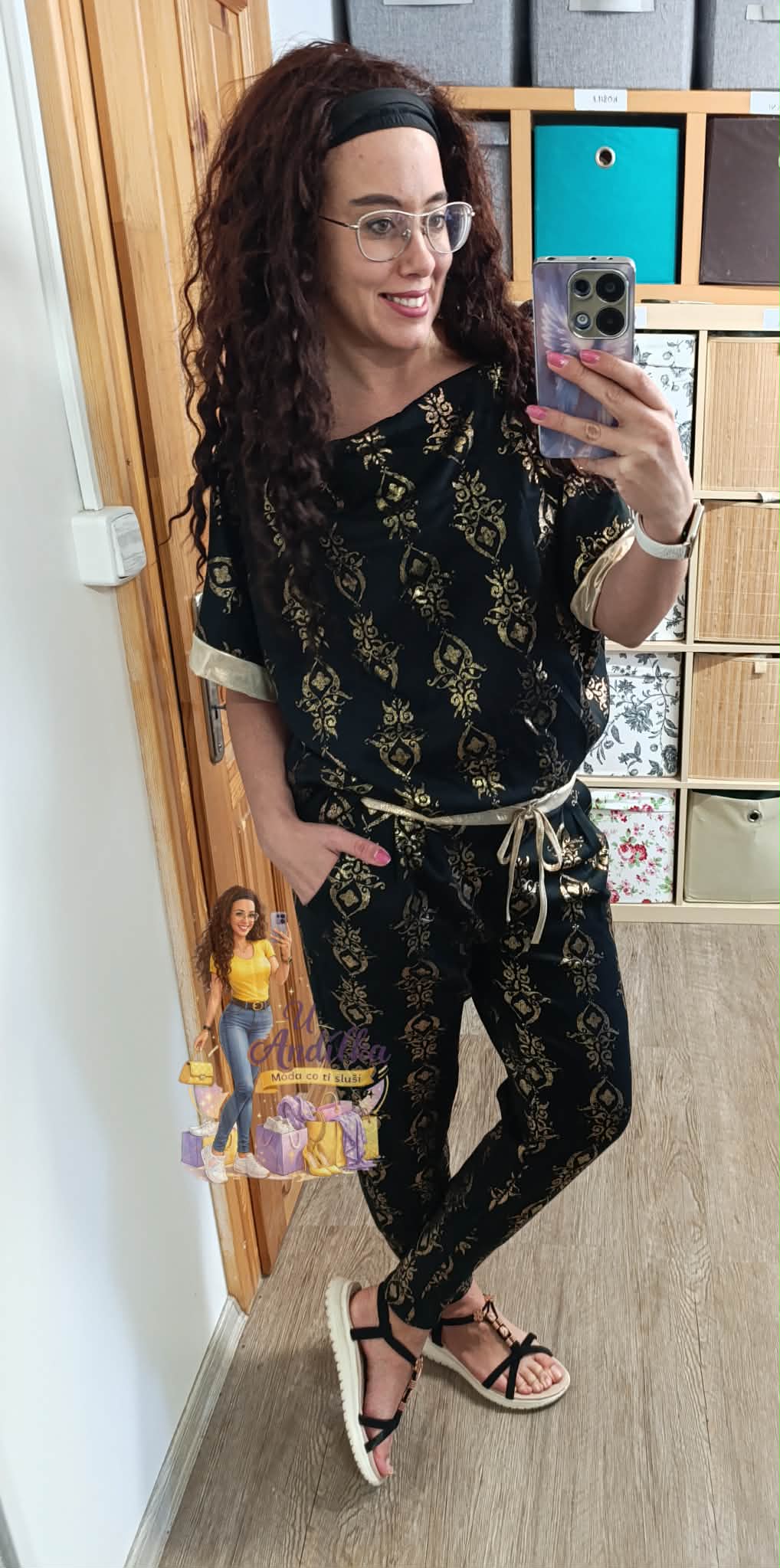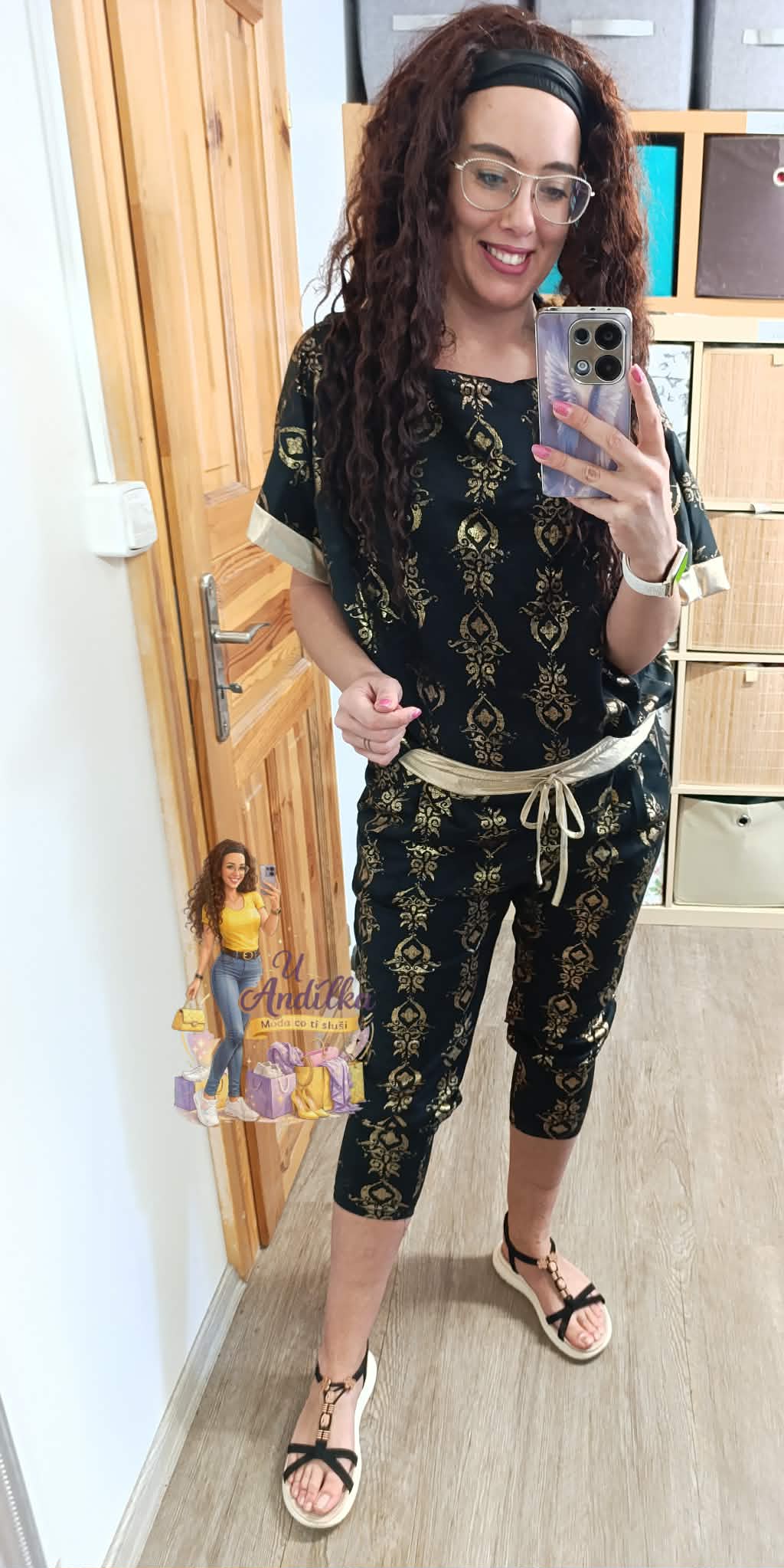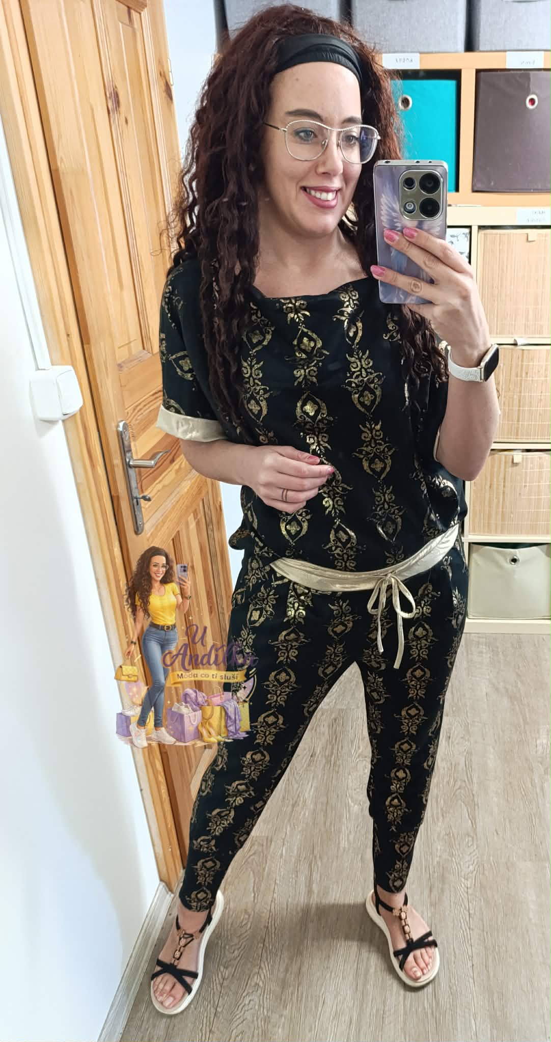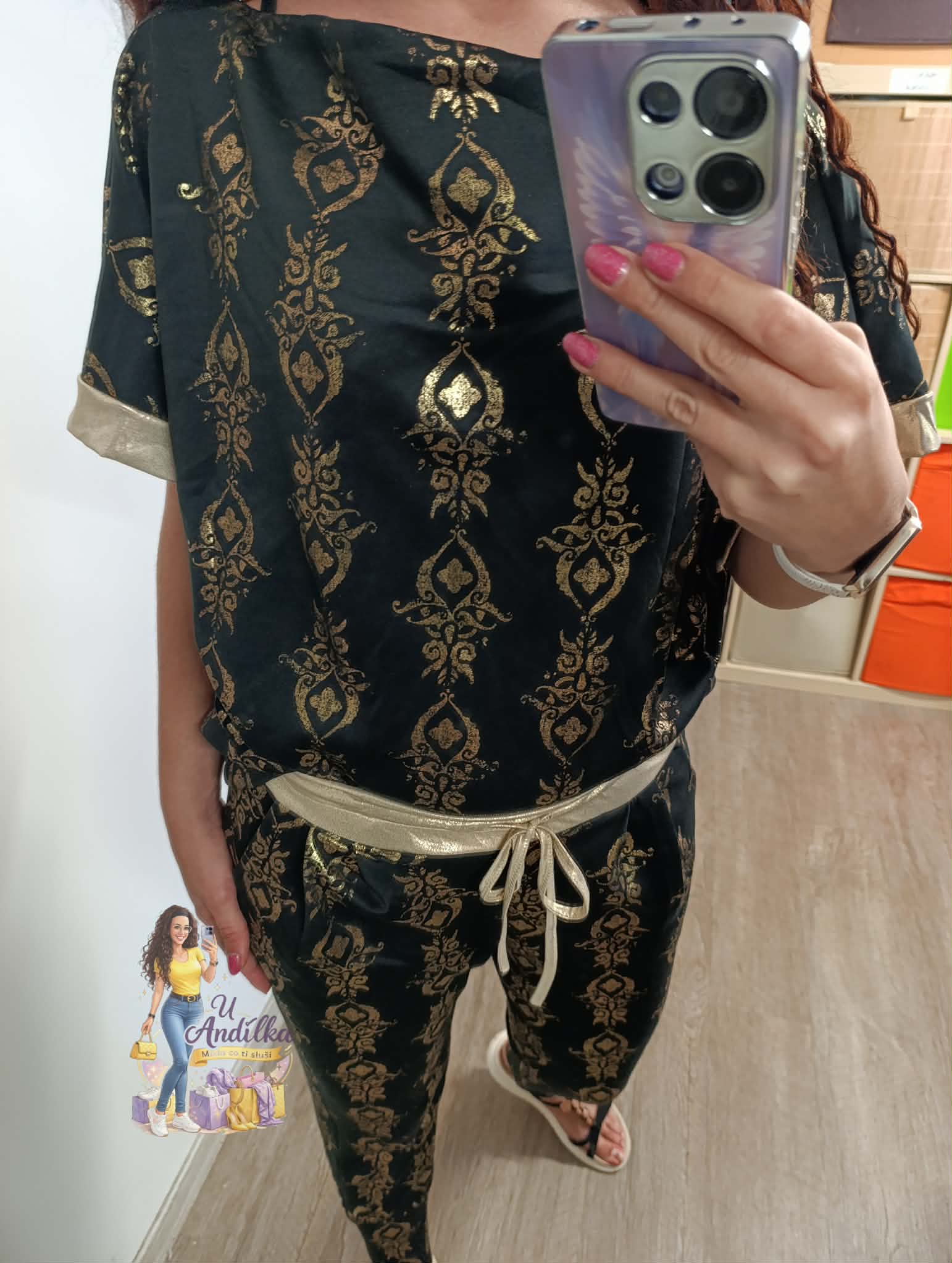 Elegantní máslový luxusní komplet - kalhoty a halenka s vodou gold vzory