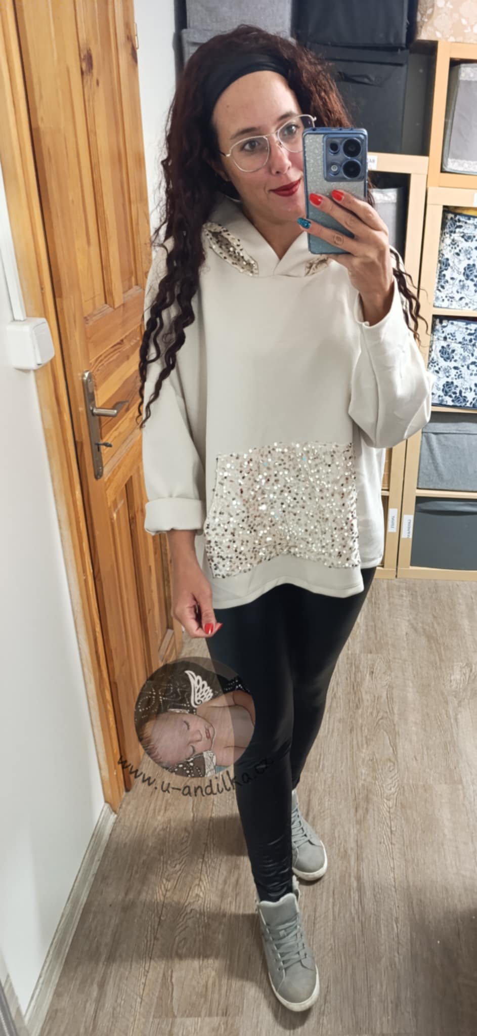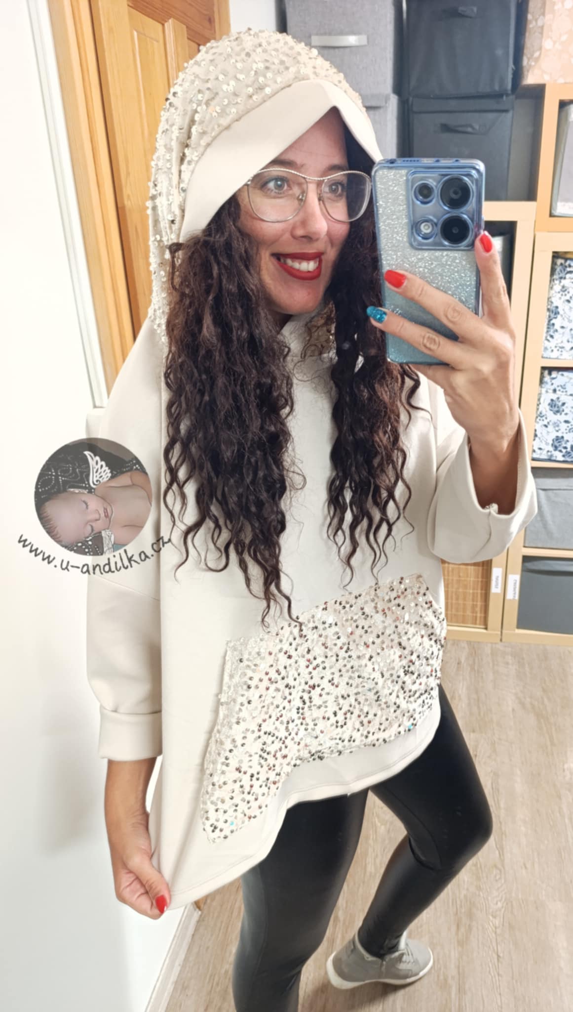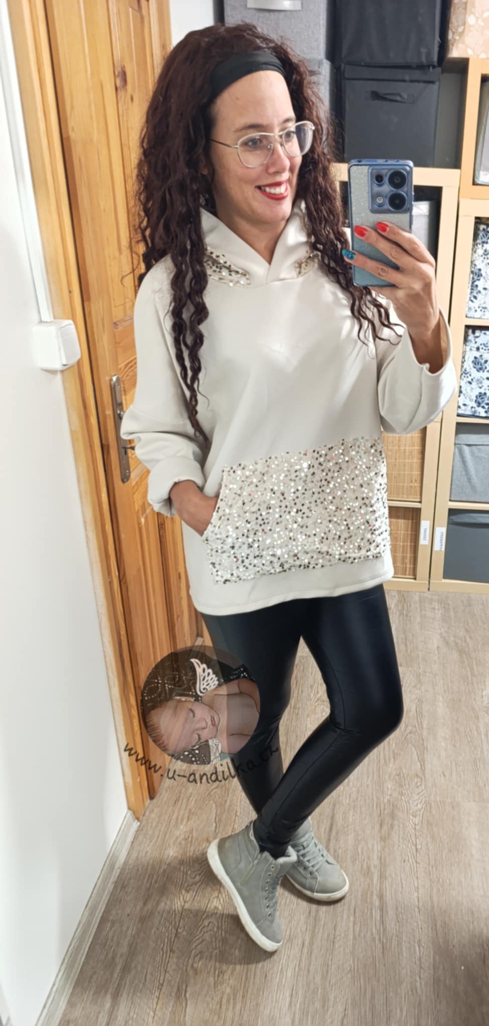 Velice příjemná, pružná, s flitry na kapse klokance i na kapuci