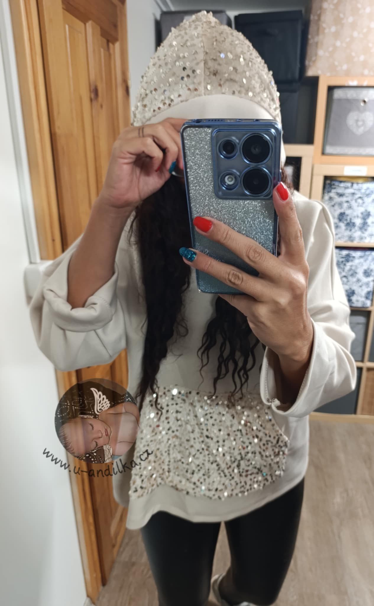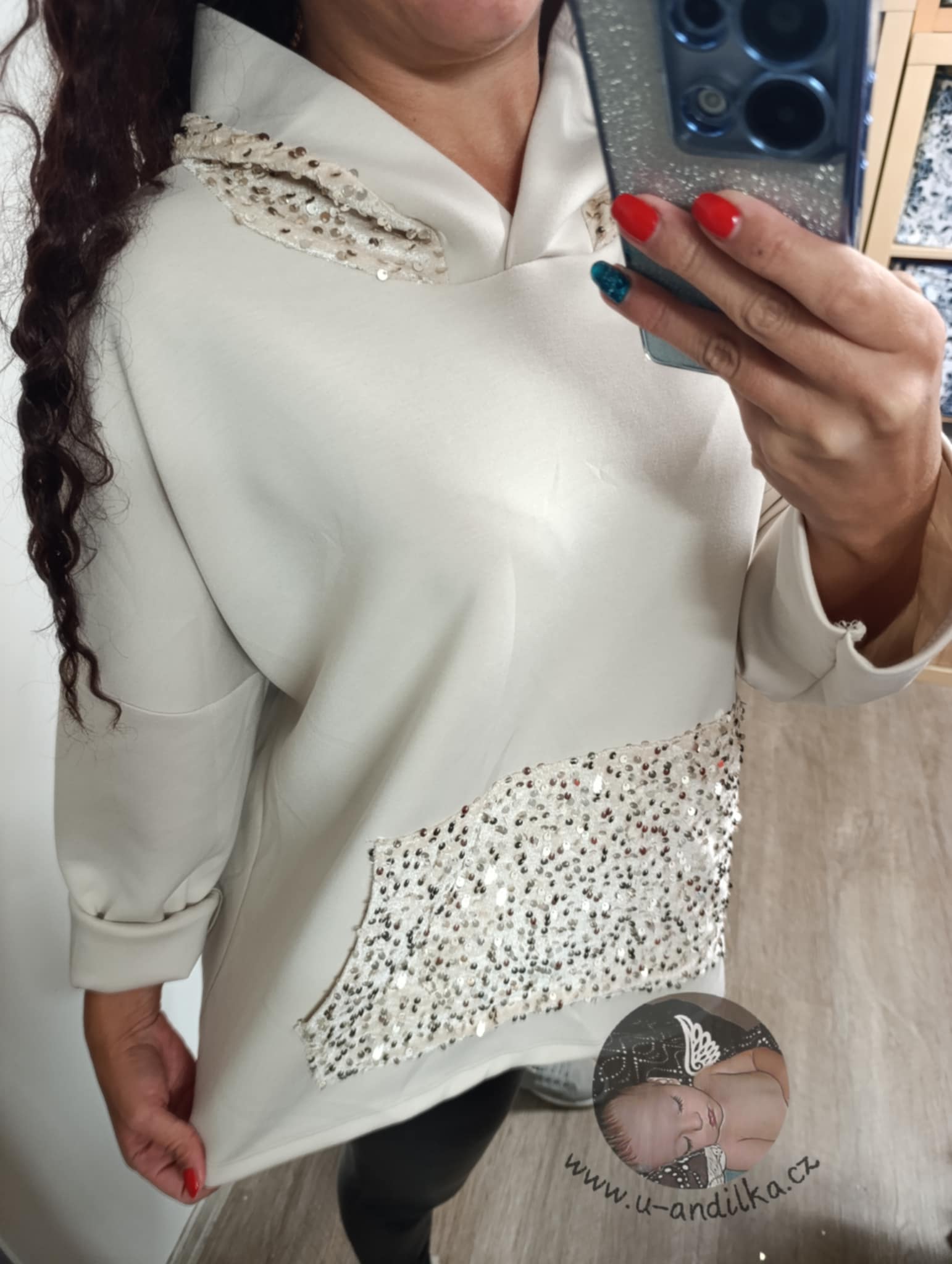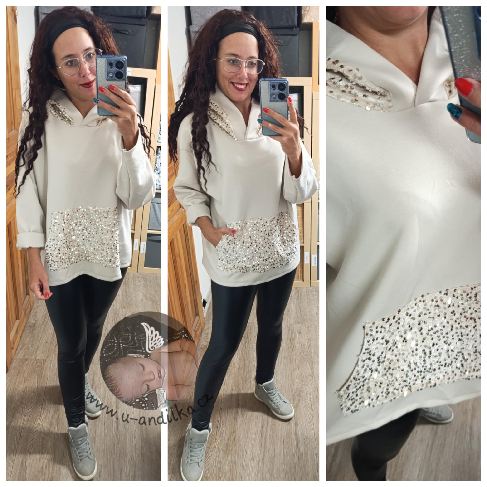 Velice příjemná, pružná, s flitry na kapse klokance i na kapuci