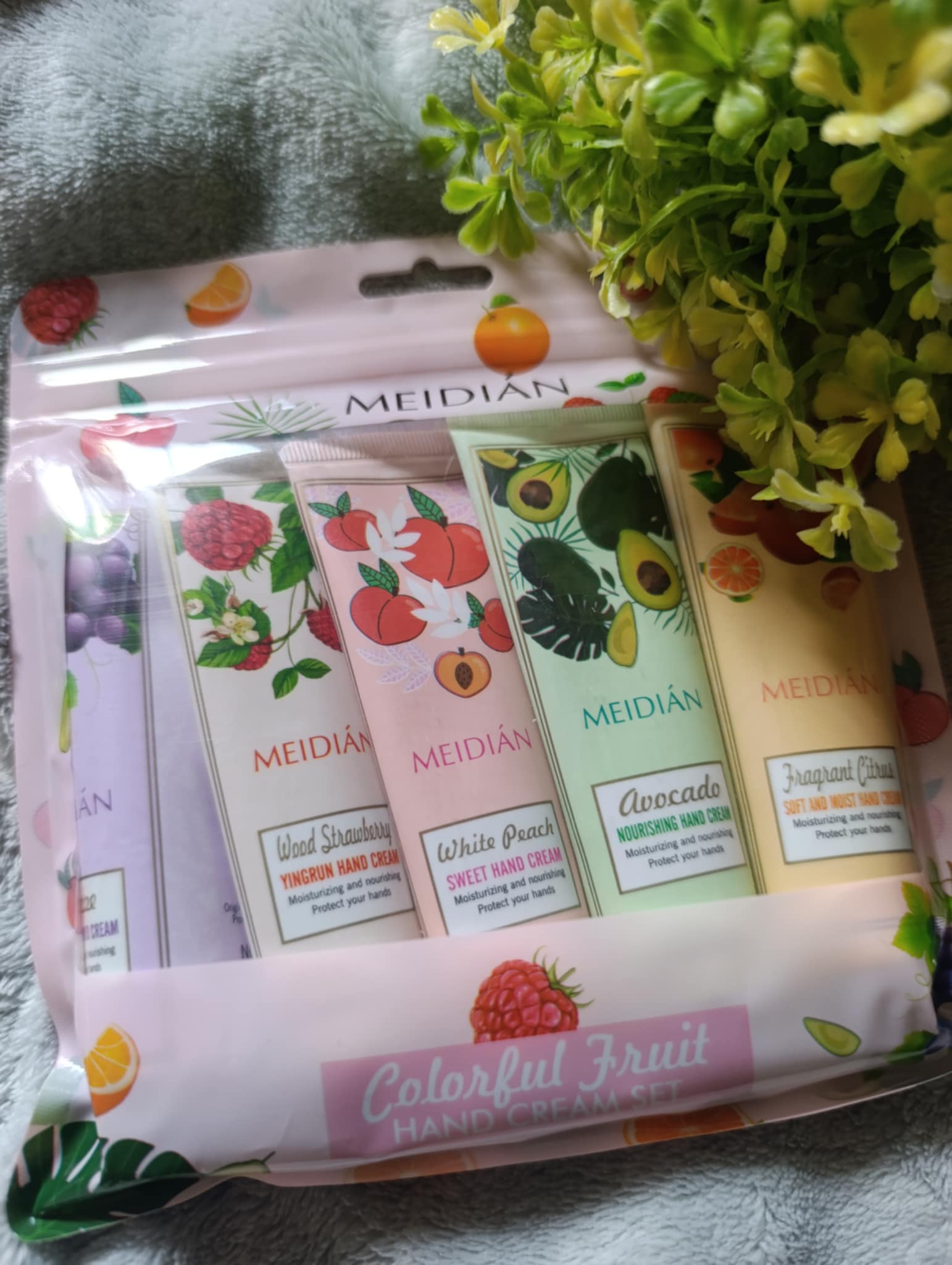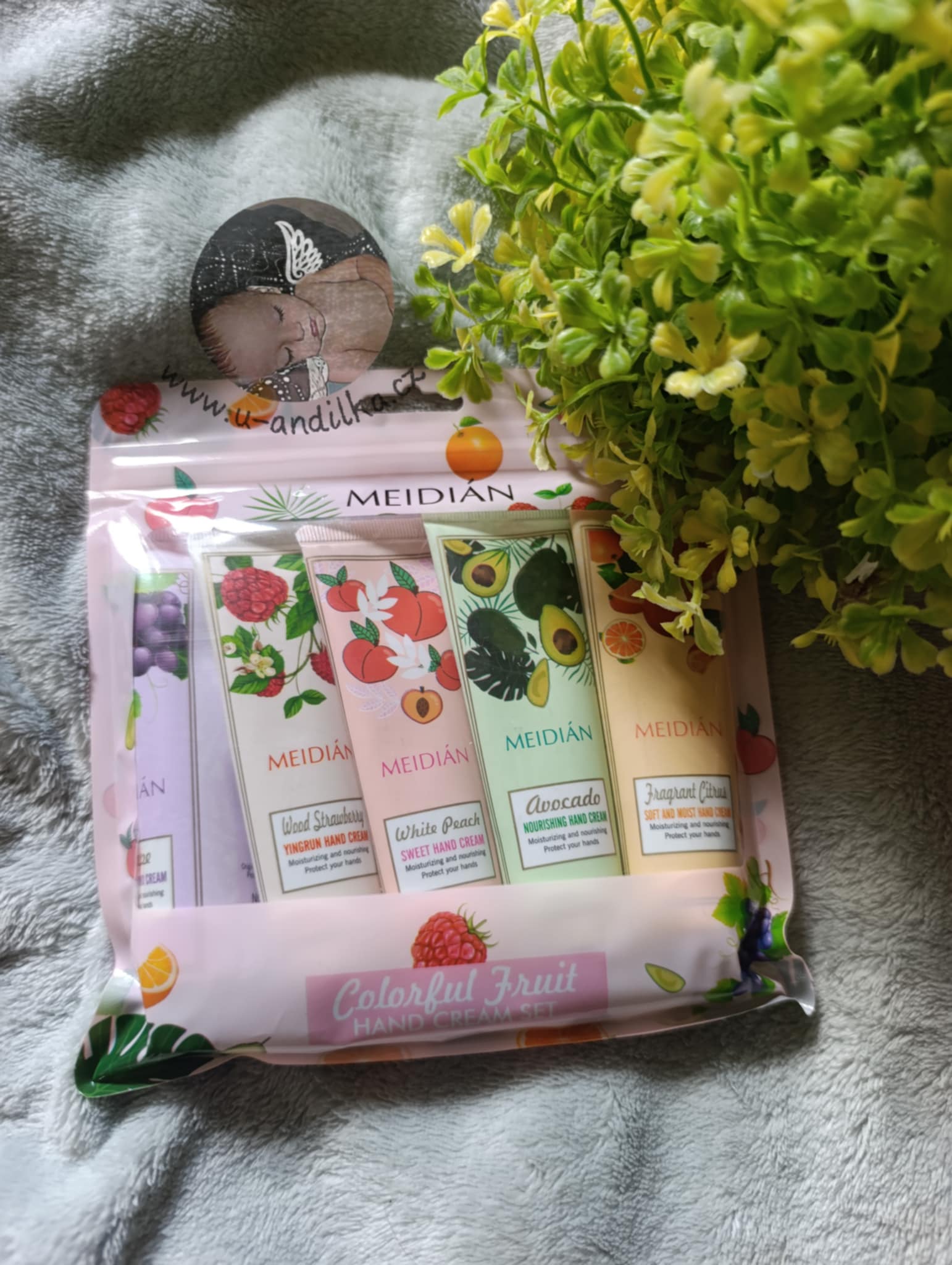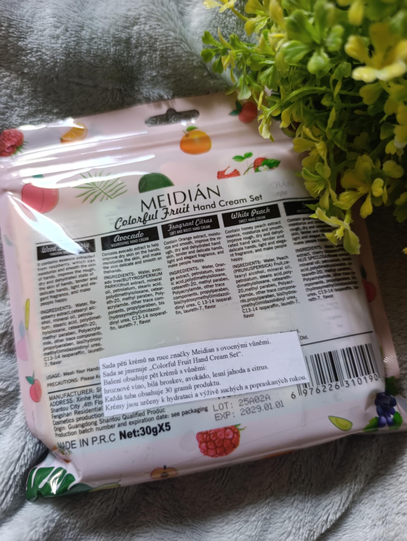 Sada pěti krémů na ruce značky Meidian s ovocnými vůněmi.
