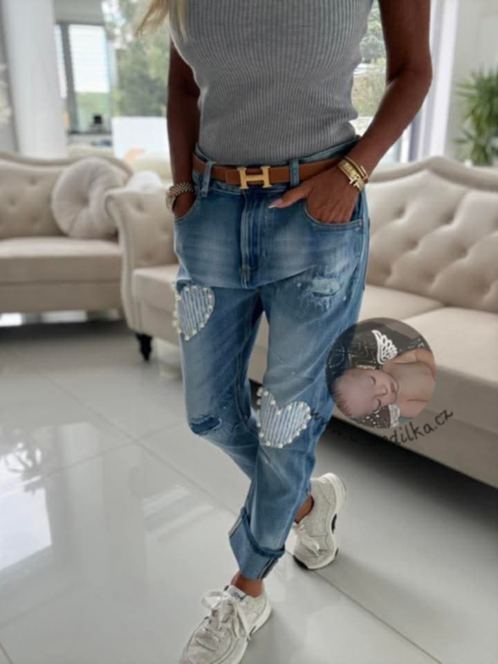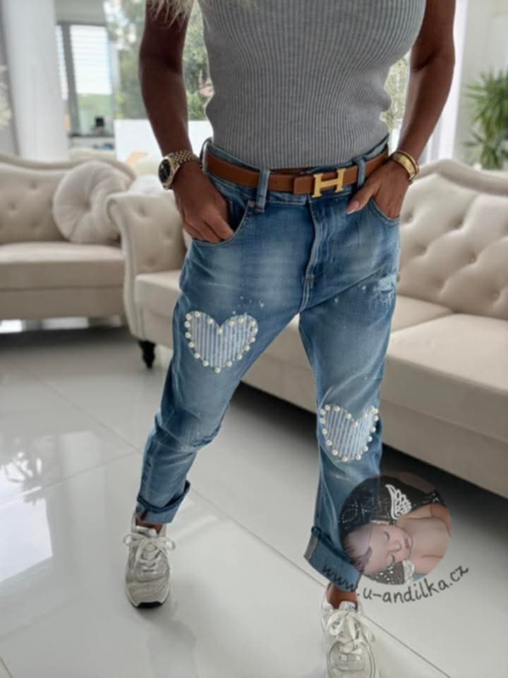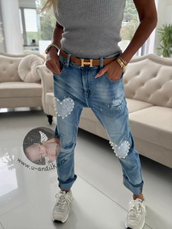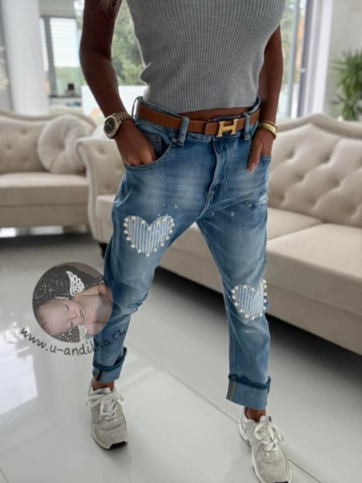 Krásné džíny se srdíčky, parádně pružné Vel. XL : Délka 96cm, pás 44-50cm x2, boky 51-59cm x2, přední sed 30cm, nohavice dole 16-20cm.x2